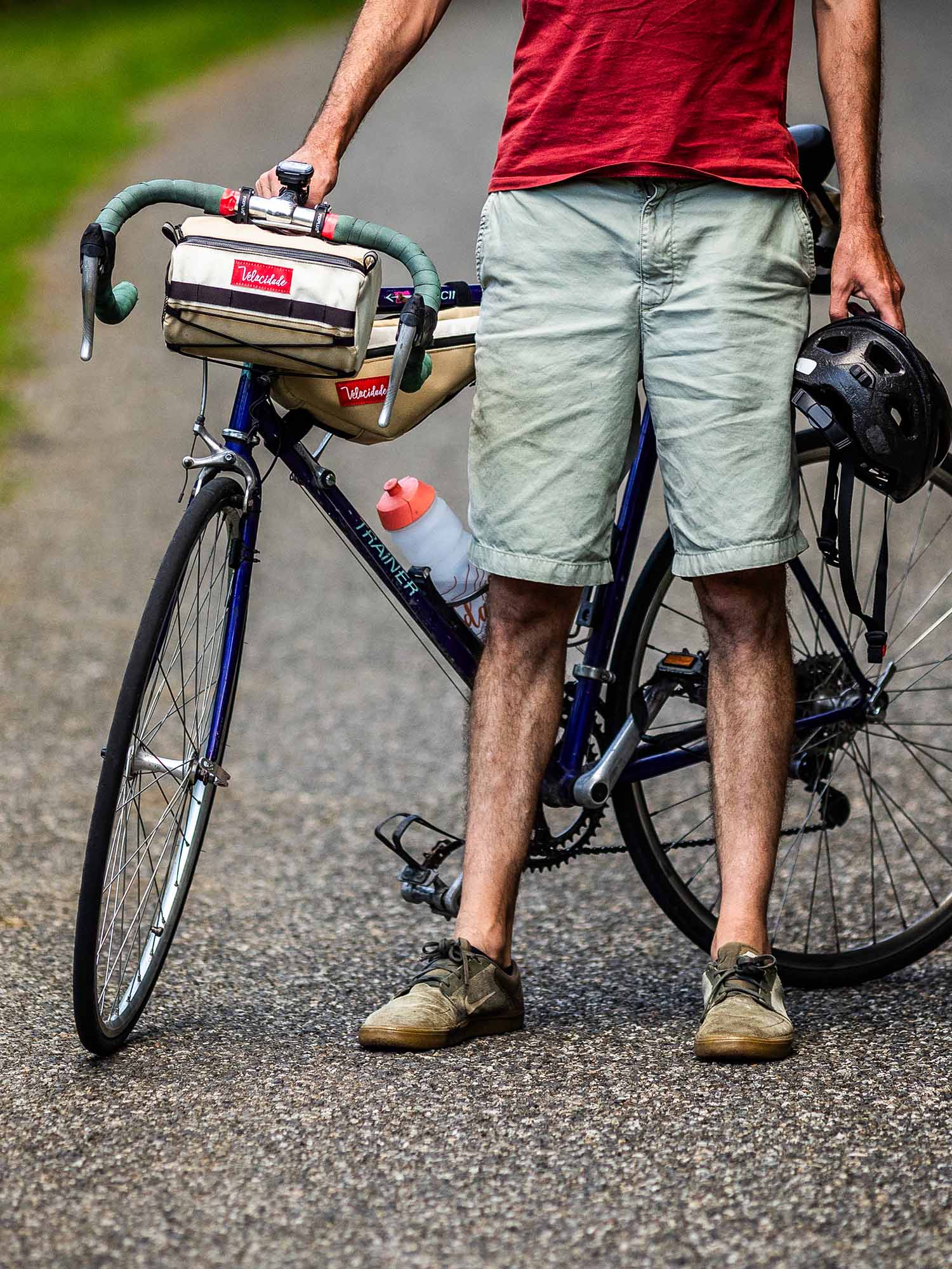 The bag attaches to the handlebars with two polyurethane straps and an elastic band at the stem.