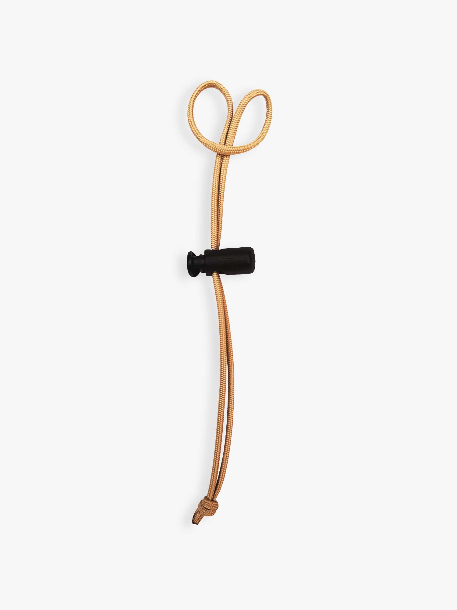 Ce cordon avec serre-cordon a été pensé comme un accessoire polyvalent, aussi pratique au quotidien qu’en aventure à vélo. Attaché par un nœud simple, il s’utilise comme porte-clés, mais peut aussi devenir une sangle de dépannage en bikepacking.